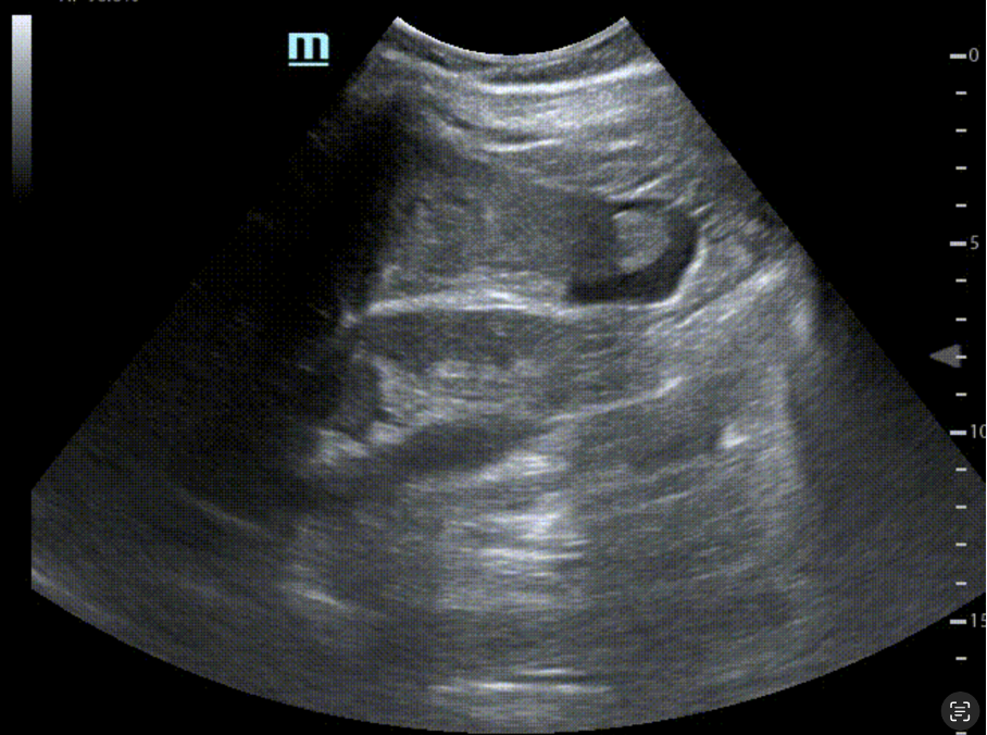 Coupe sus-pubienne en décubitus dorsal : chez l’adulte, l’épanchement libre se collecte rapidement dans le cul-de-sac. En contexte gynécologique, l’évaluation pelvienne peut nécessiter une approche complémentaire (endovaginale) selon les ressources et la pratique locale. Chez certains patients, cette coupe délivre l’image la plus parlante de l’examen en cas de traumatisme.